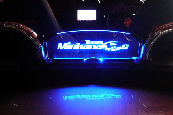 レーザー加工でアクリル板を削って絵柄を出していますので、ステッカーやペイントの様にはがれることはありません。また、LEDなどで照らすことで綺麗に浮かびあがります。
